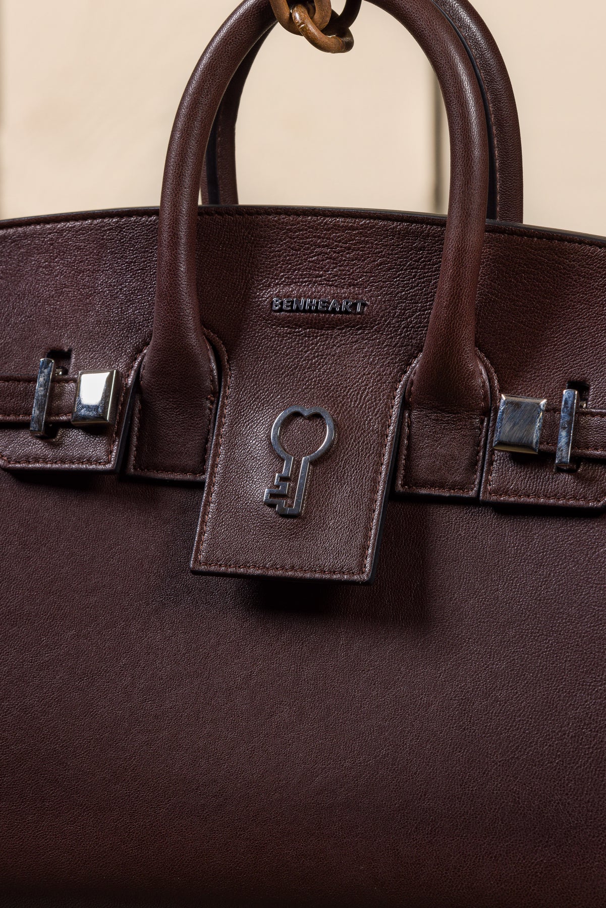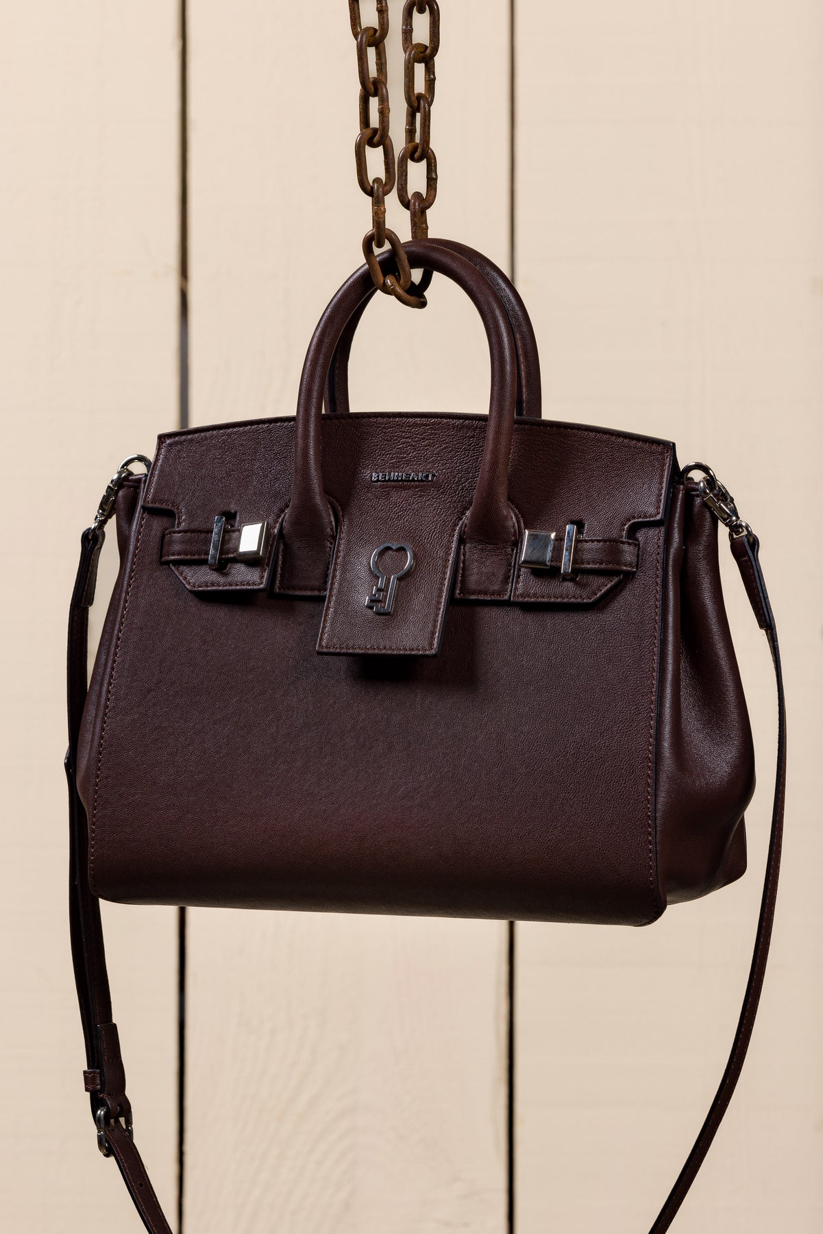 Close-up of Ginevra Small chocolate lambskin bag with Benheart logo.