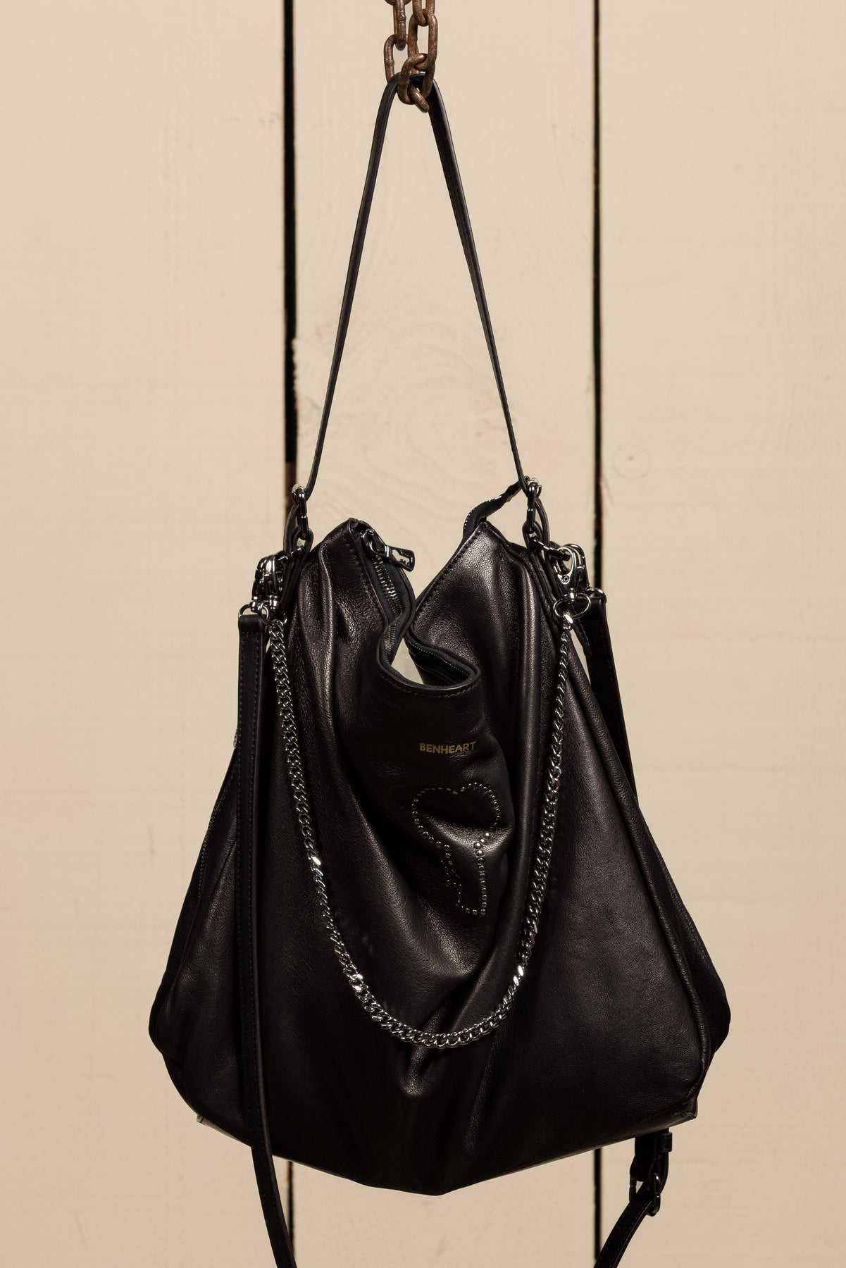 Front Logo Detail: Benheart’s signature key shape rendered in metal studs, with a gold hot-stamped logo above.