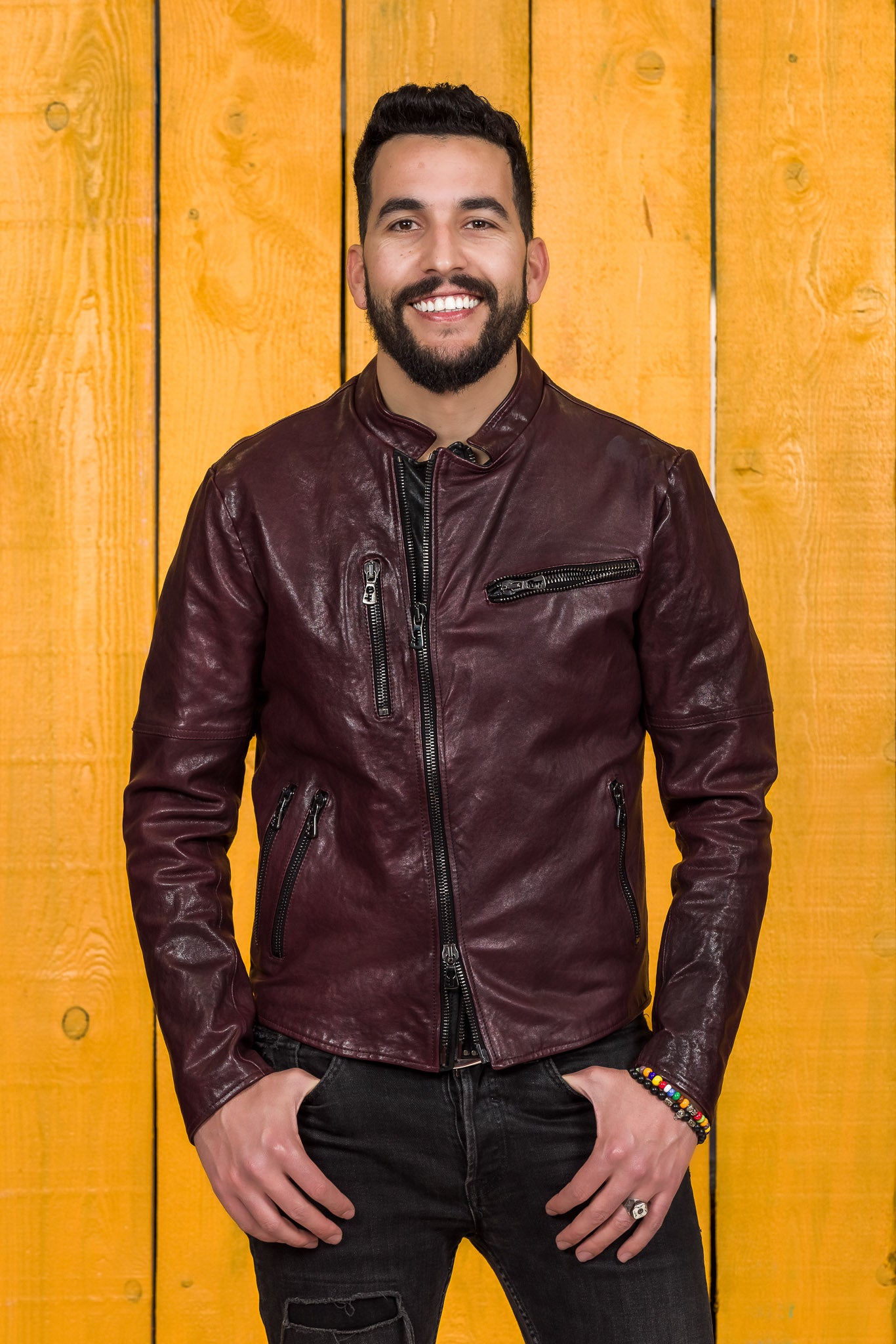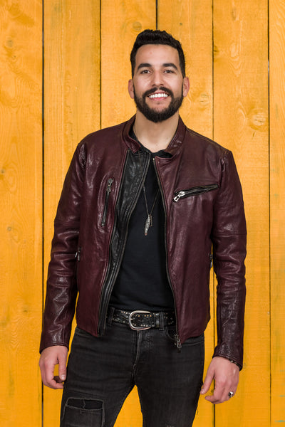 Front view of a model wearing the NELSON Limited Edition leather jacket in plum color, handcrafted in Italy by Benheart.