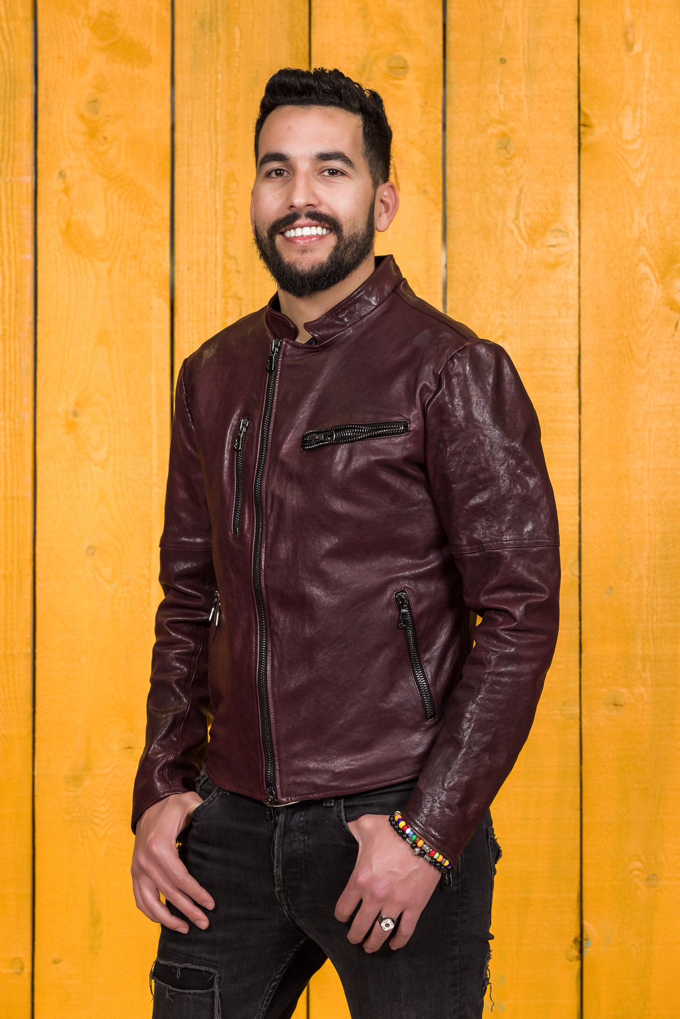 Angled front view of a model wearing the NELSON Limited Edition leather jacket in plum color
