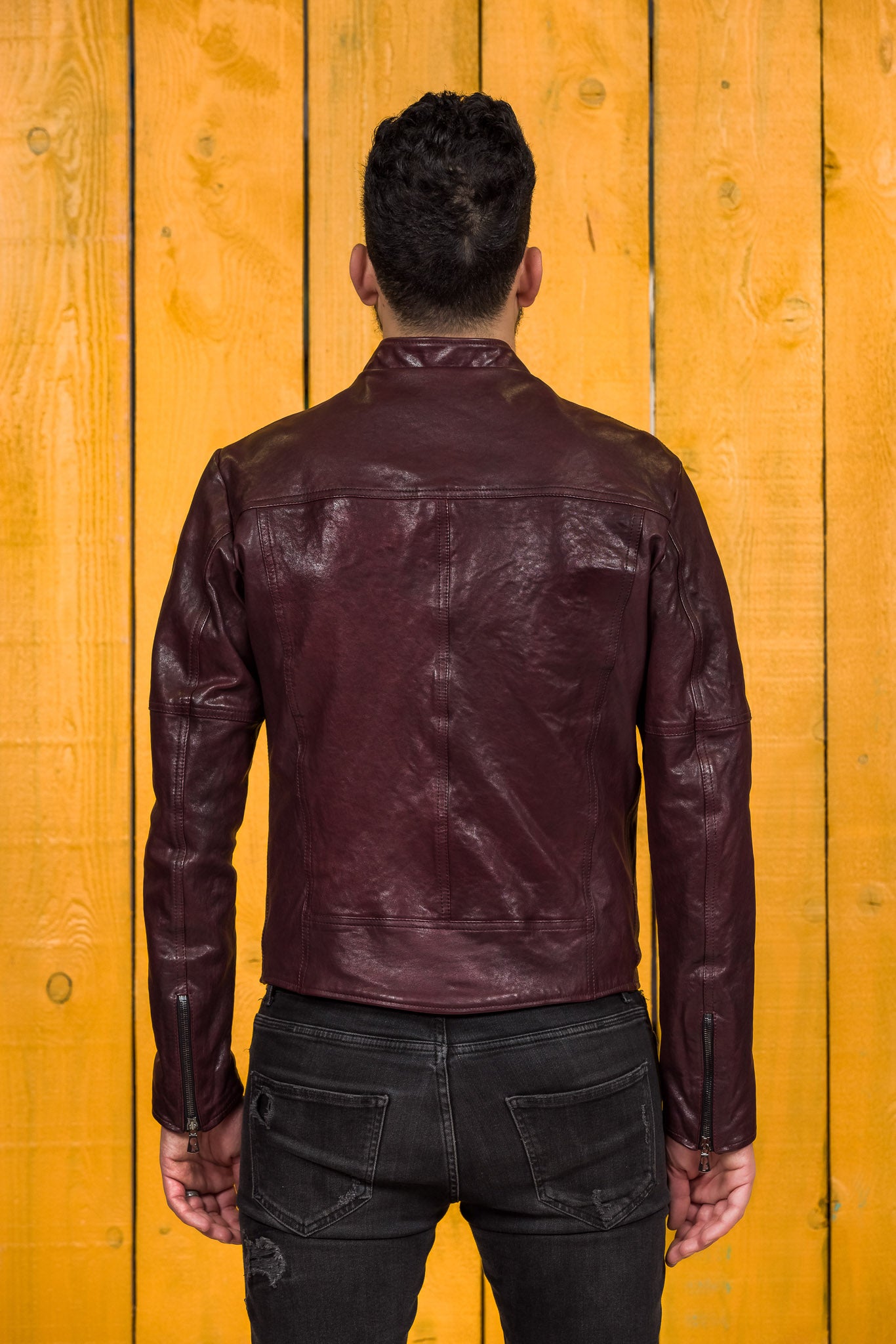 Back view of the NELSON Limited Edition leather jacket in plum color, worn by a model.