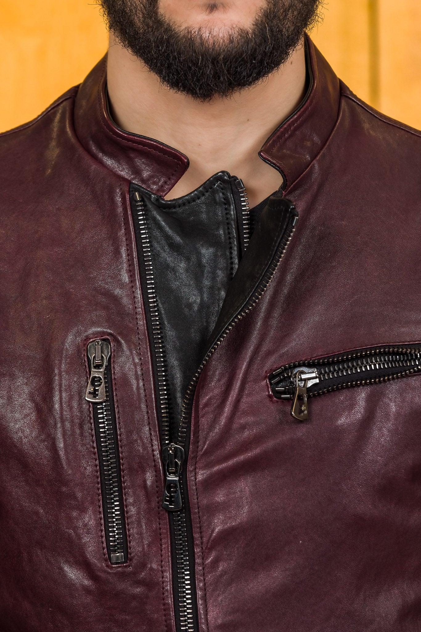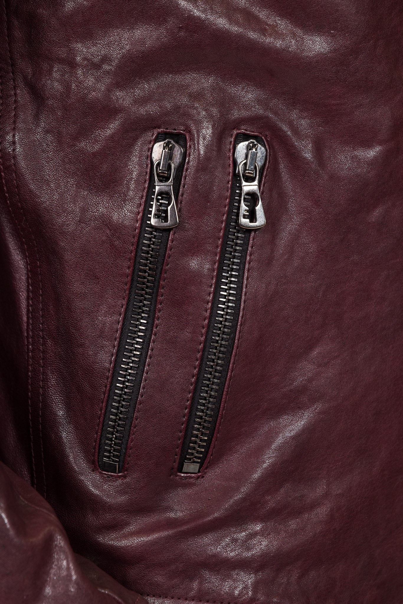 Close-up detail of the NELSON Limited Edition leather jacket in plum color by Benheart, highlighting the zippers