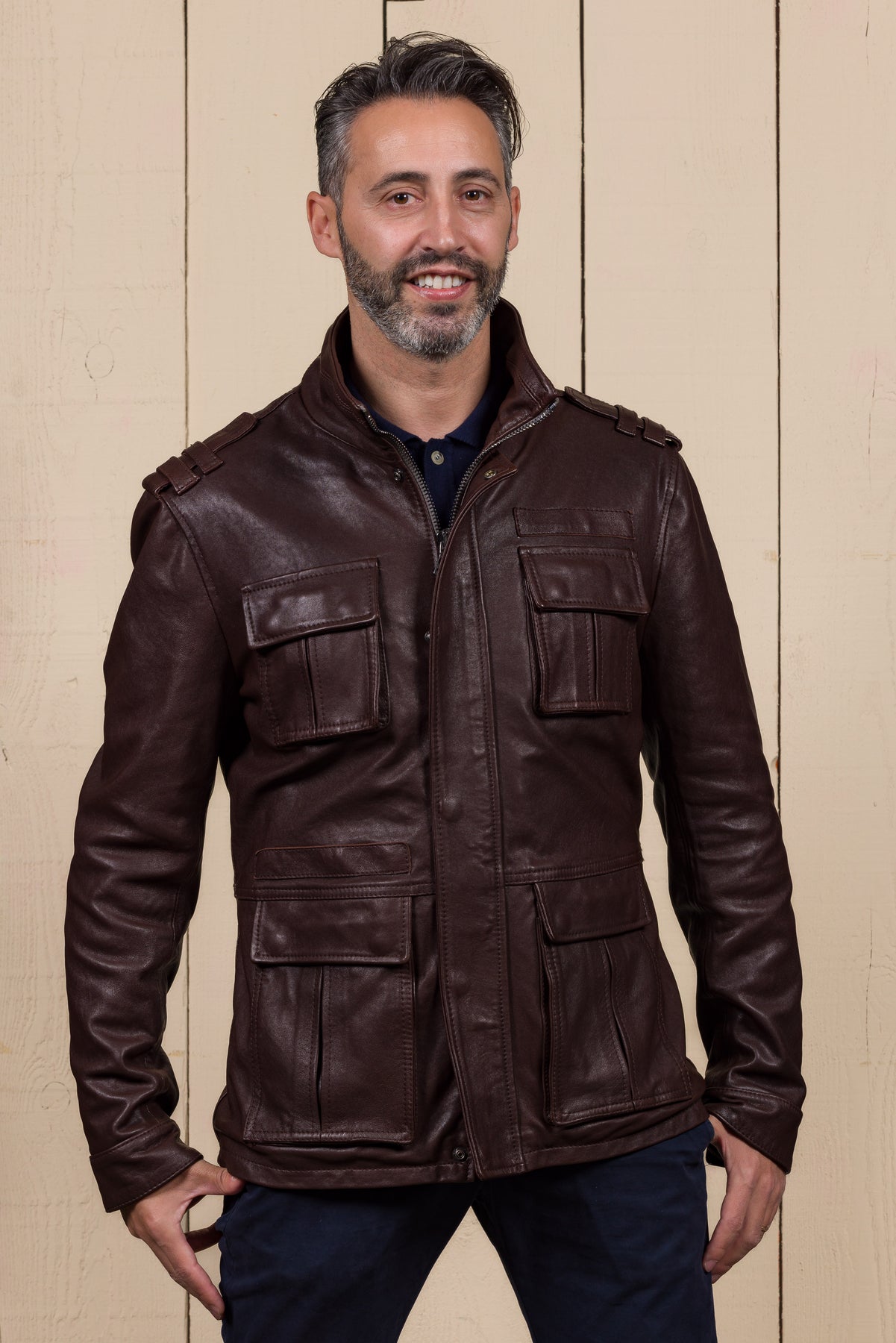 Brown Simone jacket by Benheart in garment-dyed lamb leather with four front flap pockets and shoulder details.