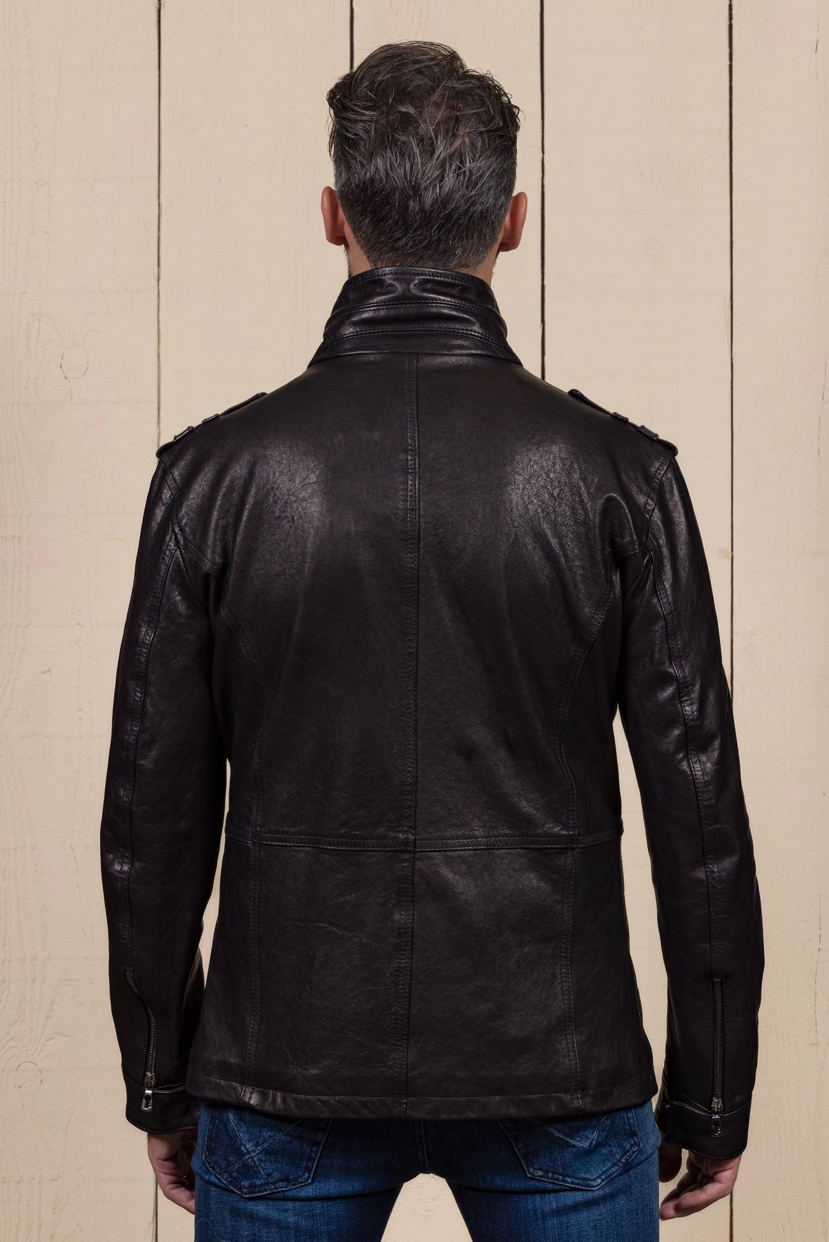 Black Simone jacket by Benheart in garment-dyed lamb leather with four front flap pockets and shoulder details.