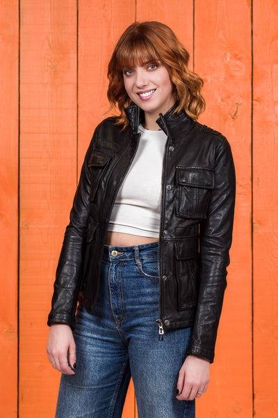 Detail of right pocket on Ilary cuoio leather jacket by Benheart, worn by model.