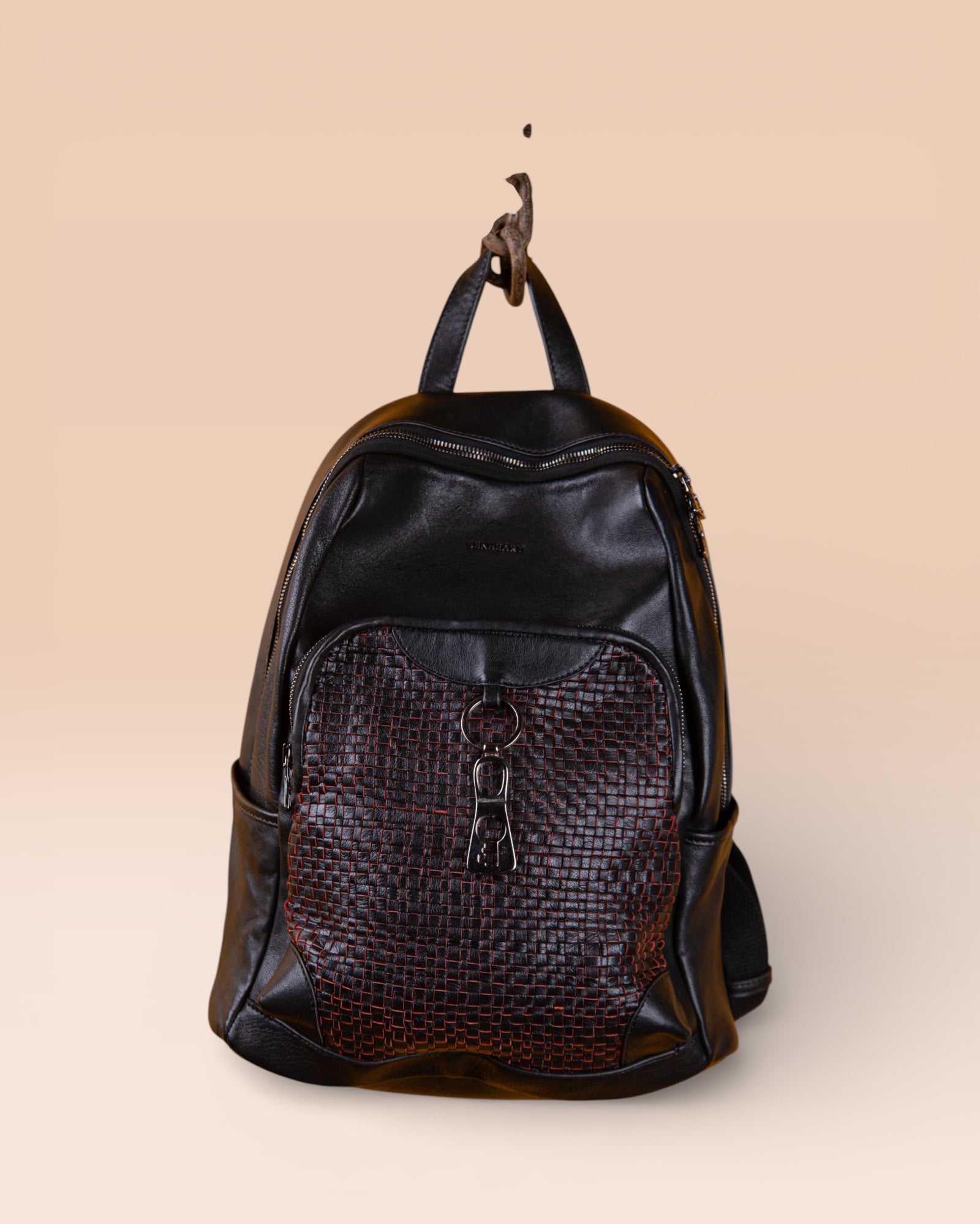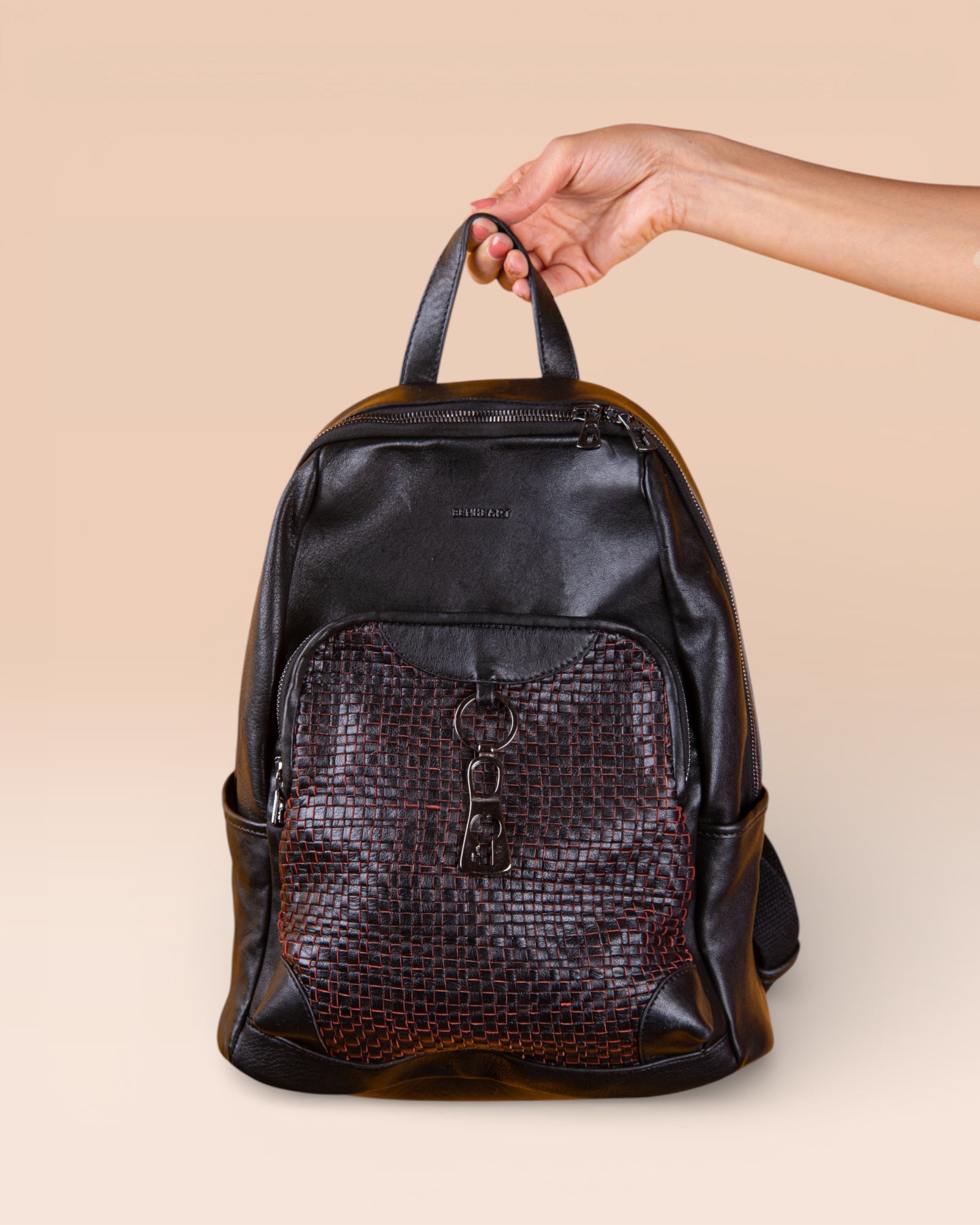 Discover ZOE, the women's leather backpack that embodies sophisticated elegance and Italian craftsmanship. Crafted from exquisite woven lambskin in shades of black and red, ZOE is the perfect accessory for the modern woman who doesn't compromise on style or functionality. Ideal for elevating any outfit, from casual chic to more formal, this luxury backpack is a true statement of fashion and quality.