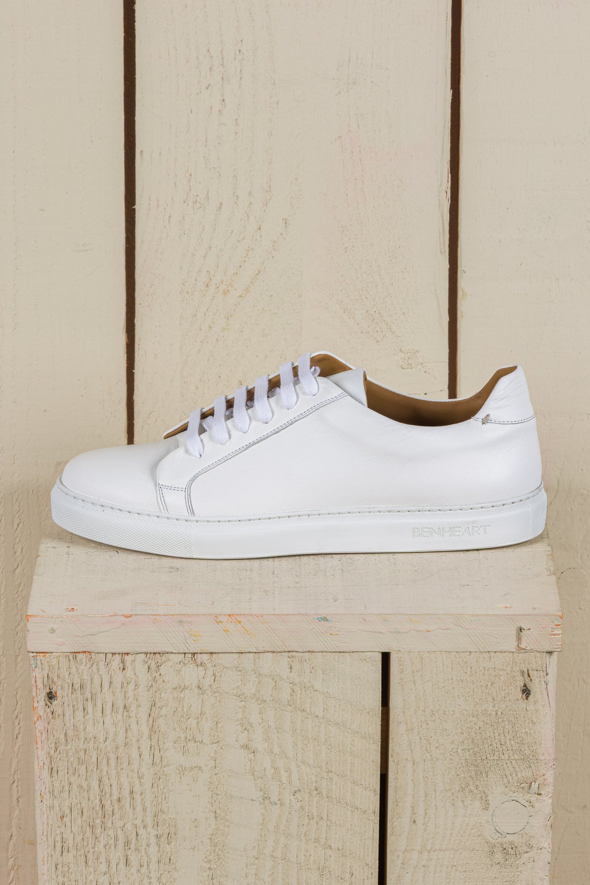 Benheart Leclerc men’s white leather low-top sneakers, front angled view.