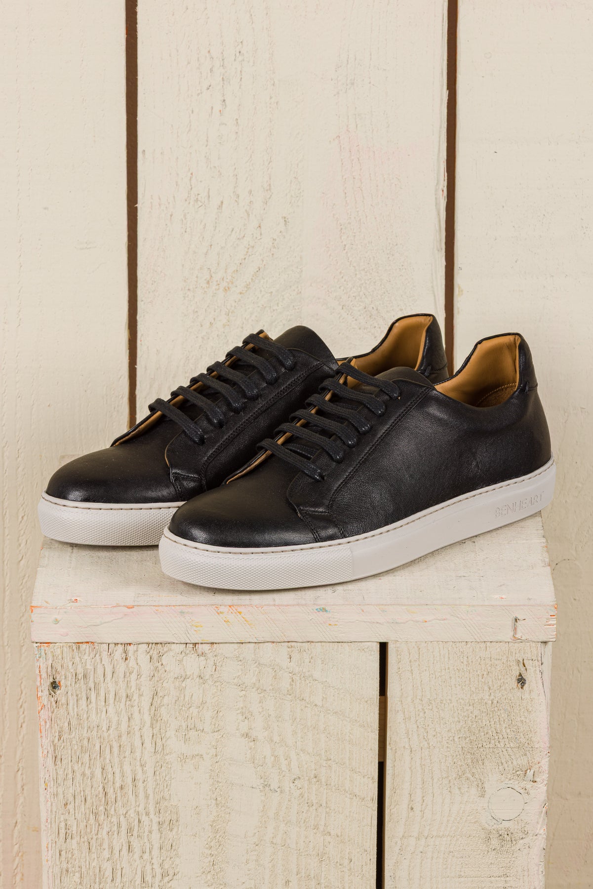 Benheart Leclerc men’s black leather low-top sneakers, side view.