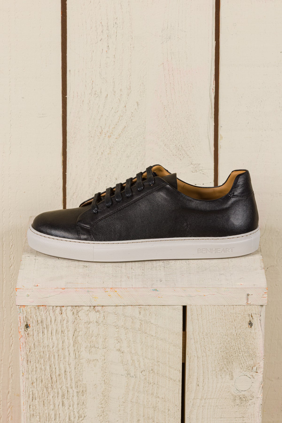 Benheart Leclerc men’s black leather low-top sneakers, side angled view.