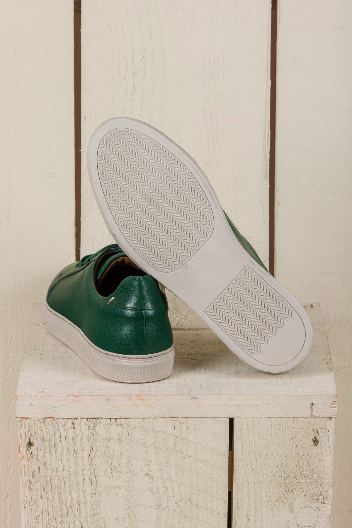 Benheart Leclerc men’s green leather low-top sneakers, side angled view.