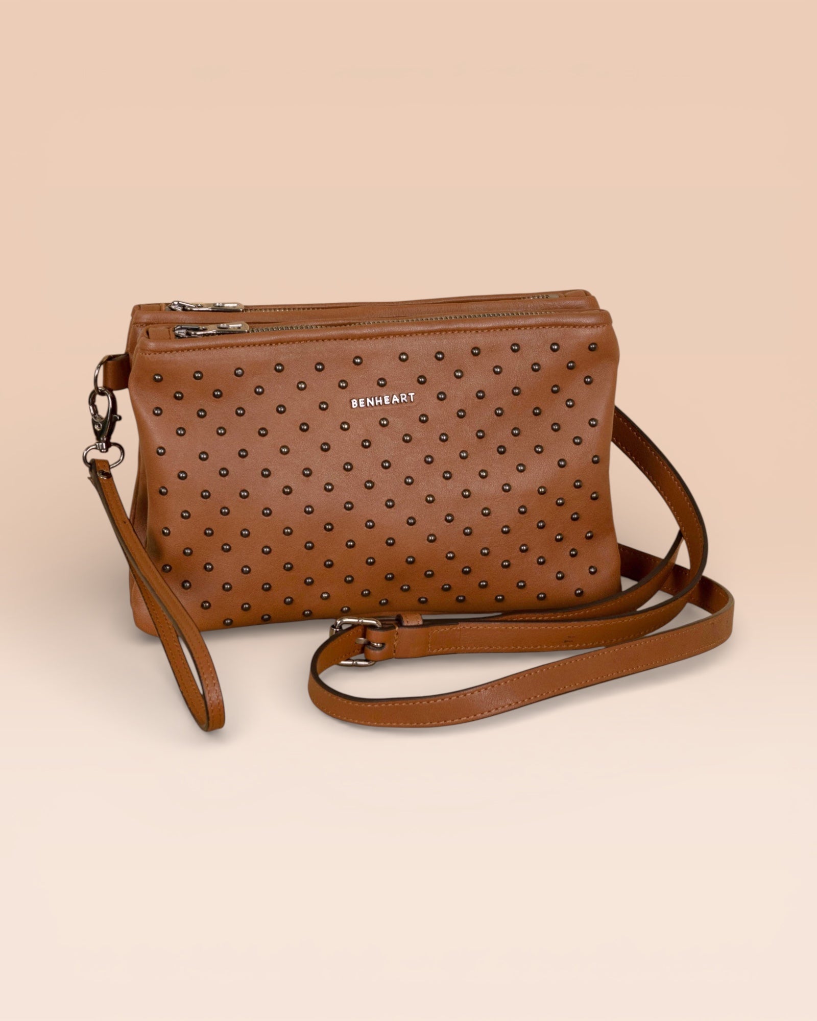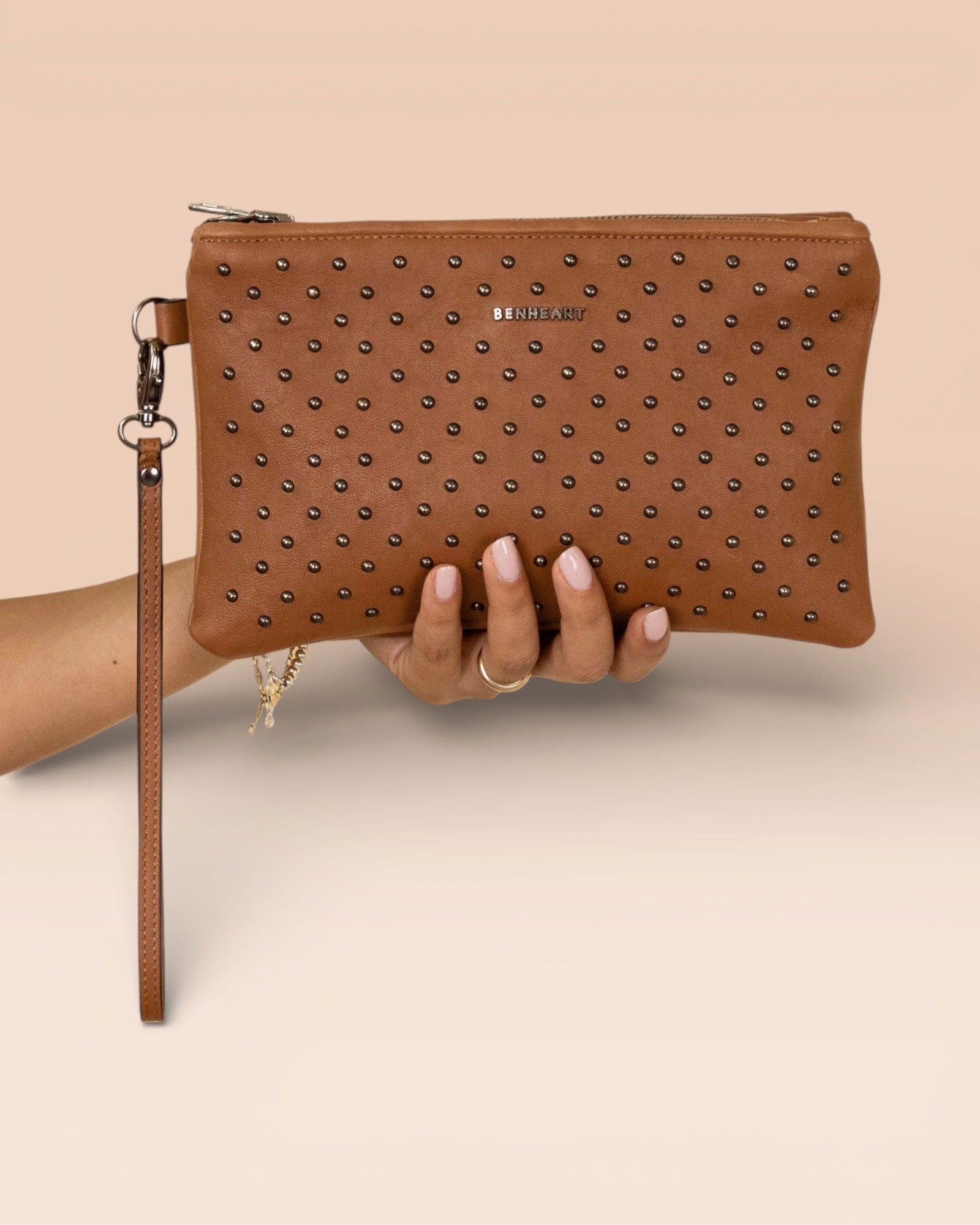 The Benheart "Desert" studded clutch bag embodies bold elegance and Florentine craftsmanship. Handcrafted with mastery from exquisite leather, this compact and versatile bag is a luxury accessory that captures attention, perfect for elevating any outfit with a distinctive and sophisticated touch.