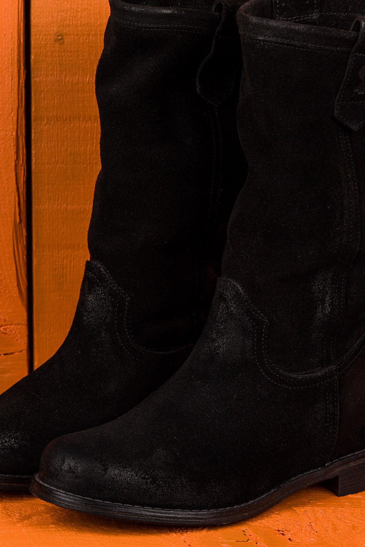 Benheart Agnese 5555 women’s black suede leather boots, close up view.