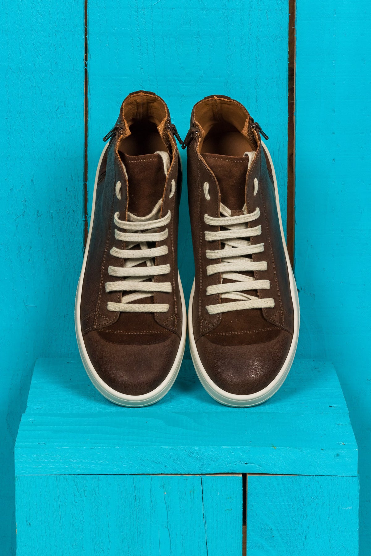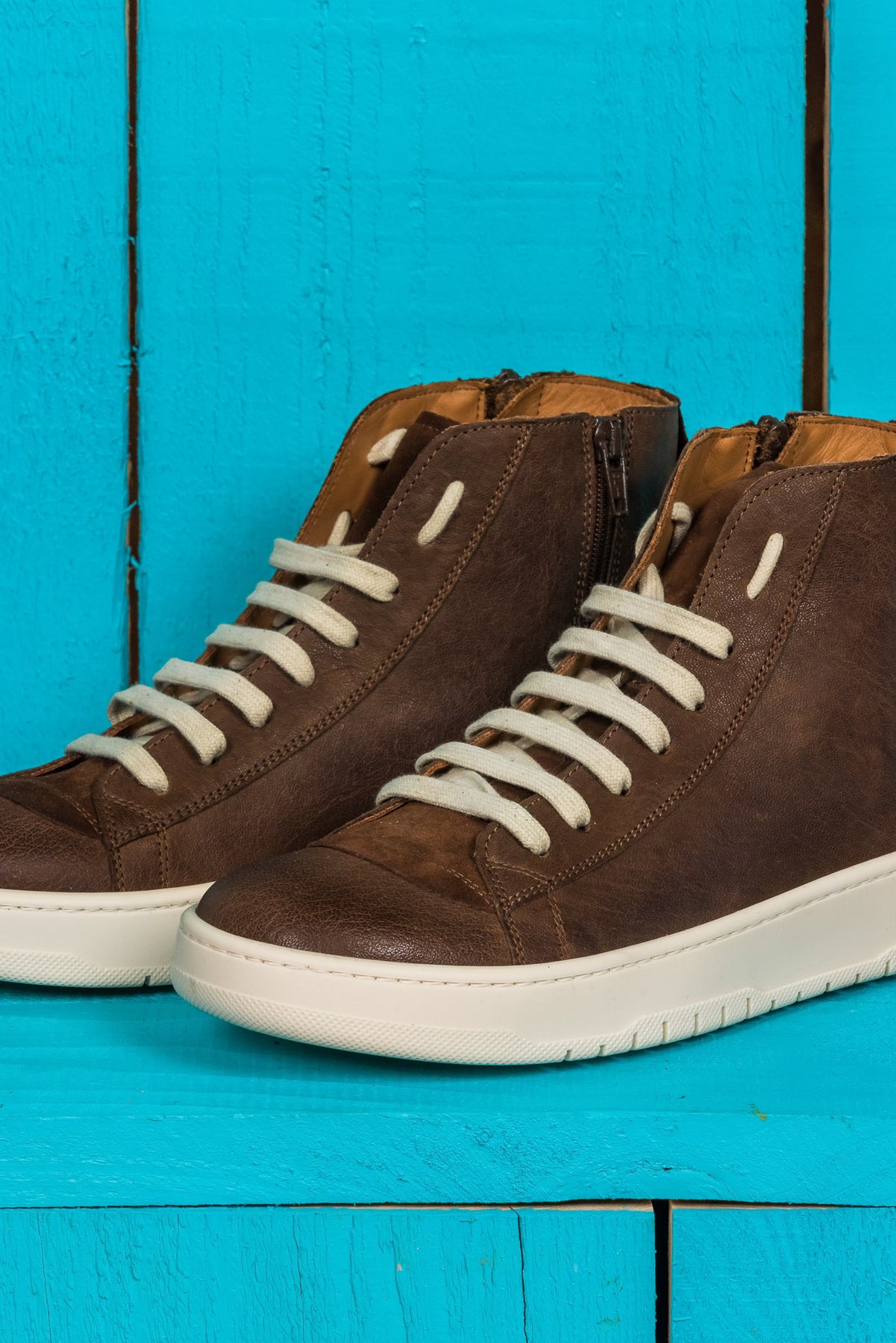 Benheart Bonetti 8473 Unisex Brown Leather High-Top Sneakers Worn by a Female Model.