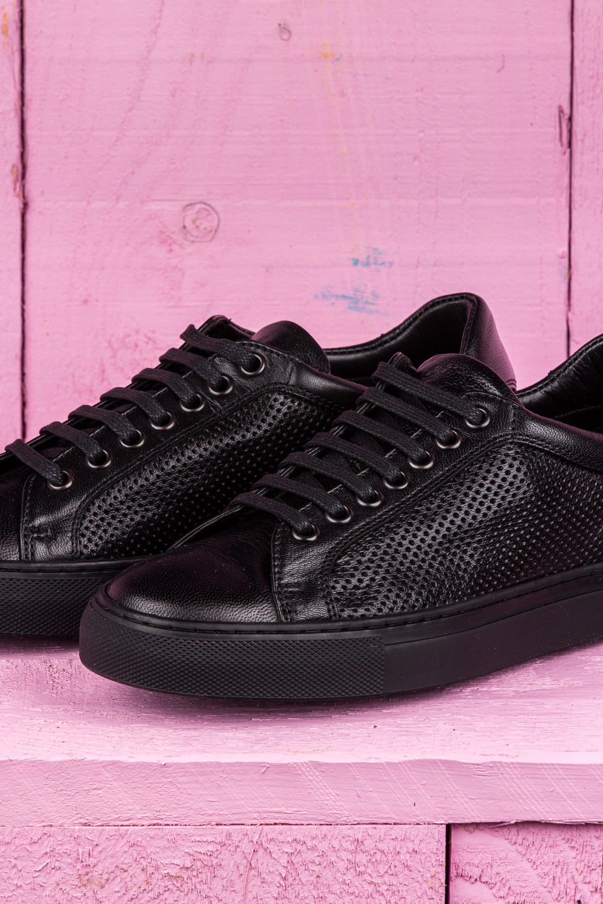 Close up view of Benheart Lario unisex perforated leather sneakers shoes in black color.