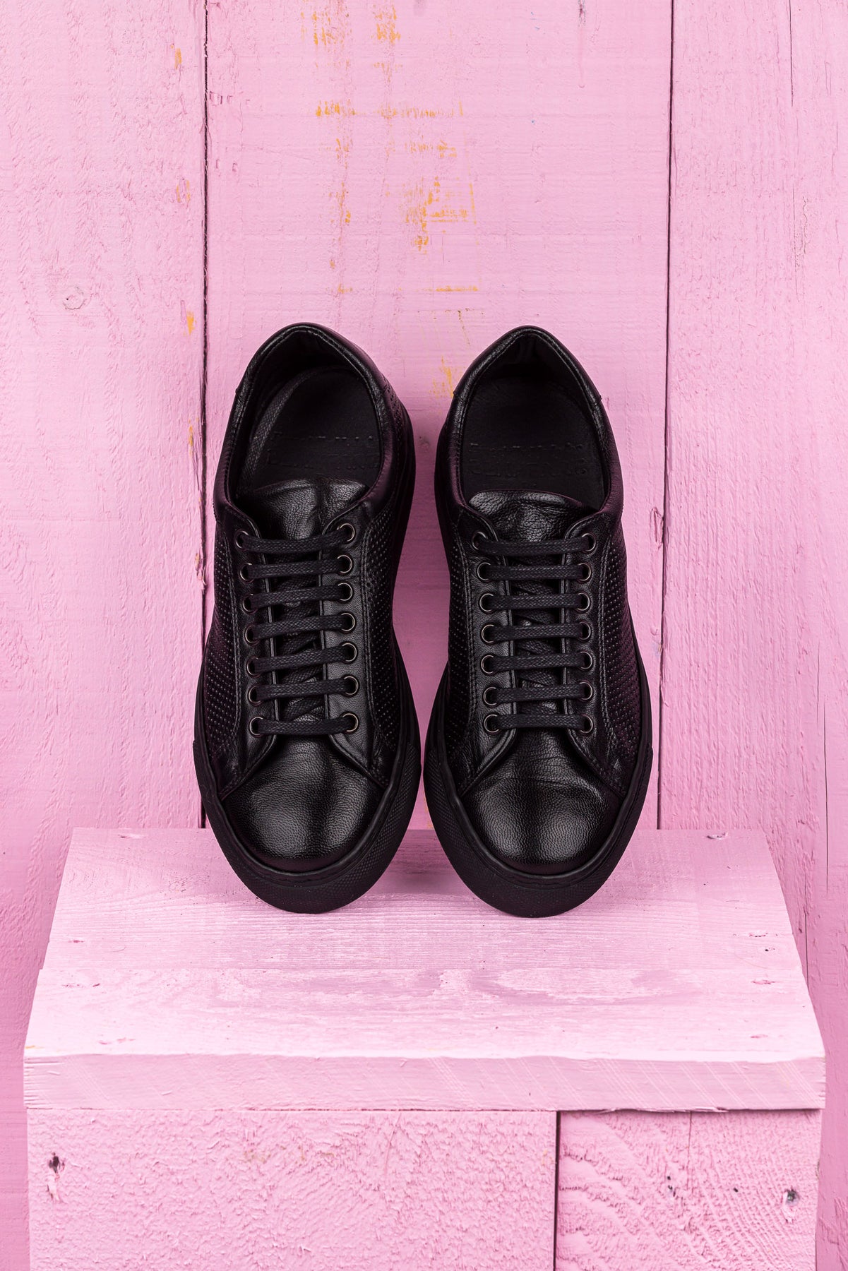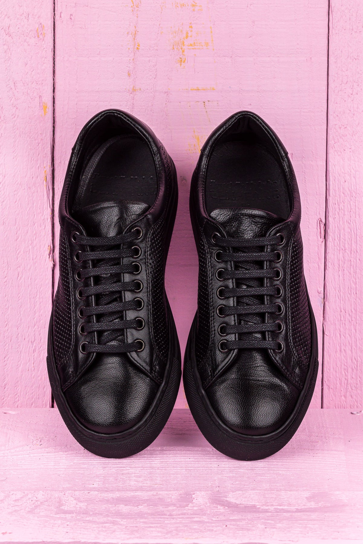 Front angled and top view of Benheart Lario unisex perforated leather sneakers shoes in black color.