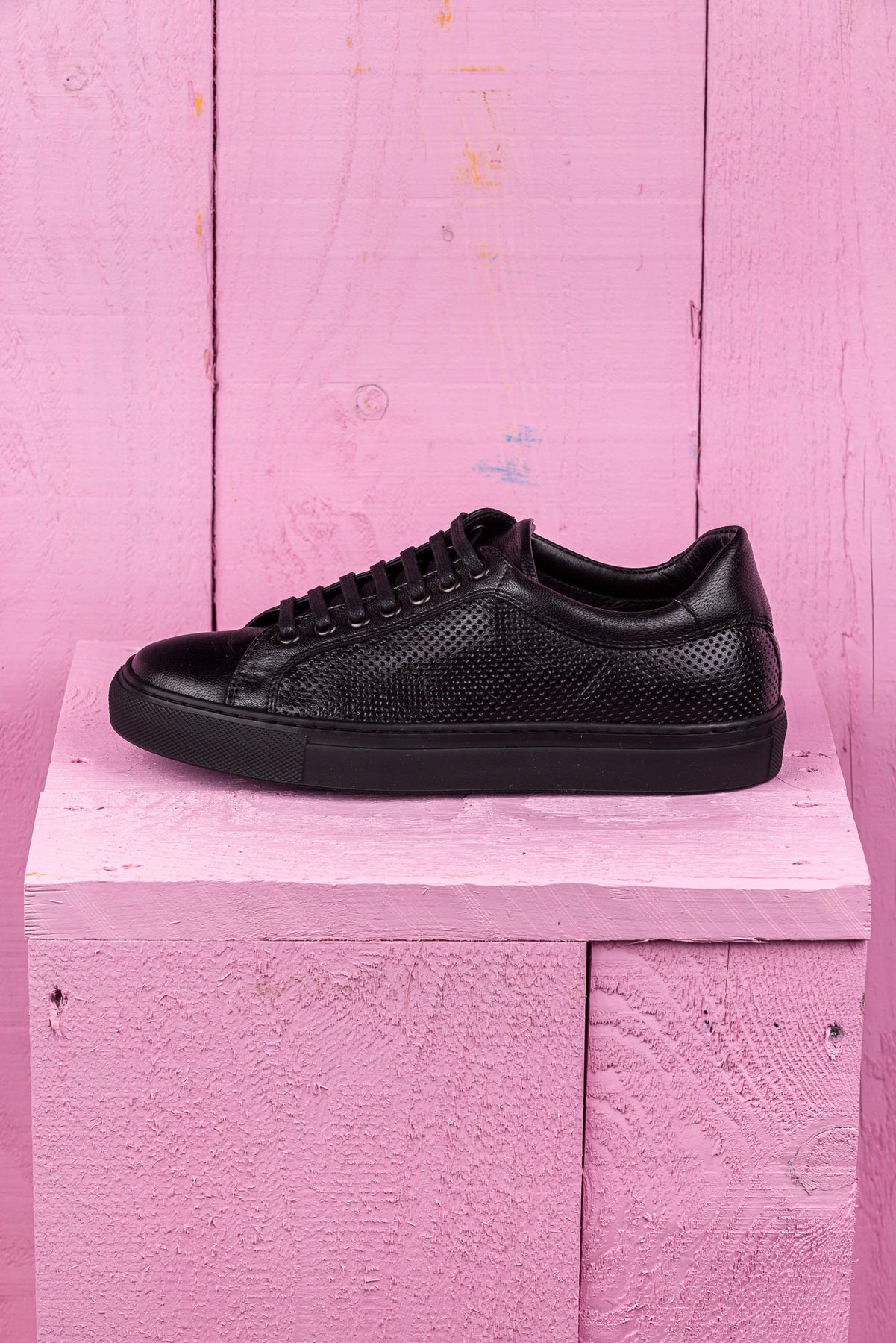 Benheart Lario unisex black perforated leather low-top sneakers, side view.