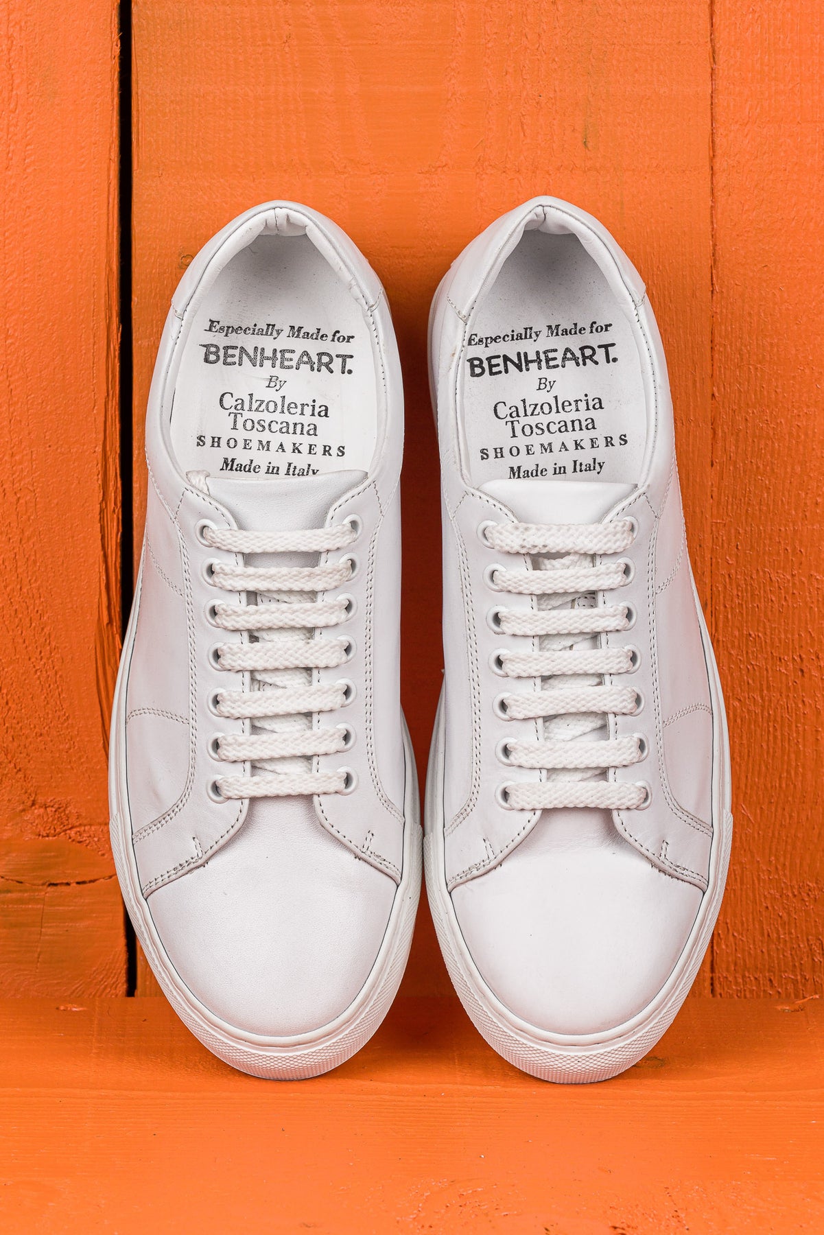 Close up view of Venus unisex white leather sneakers by Benheart, handcrafted in Florence.