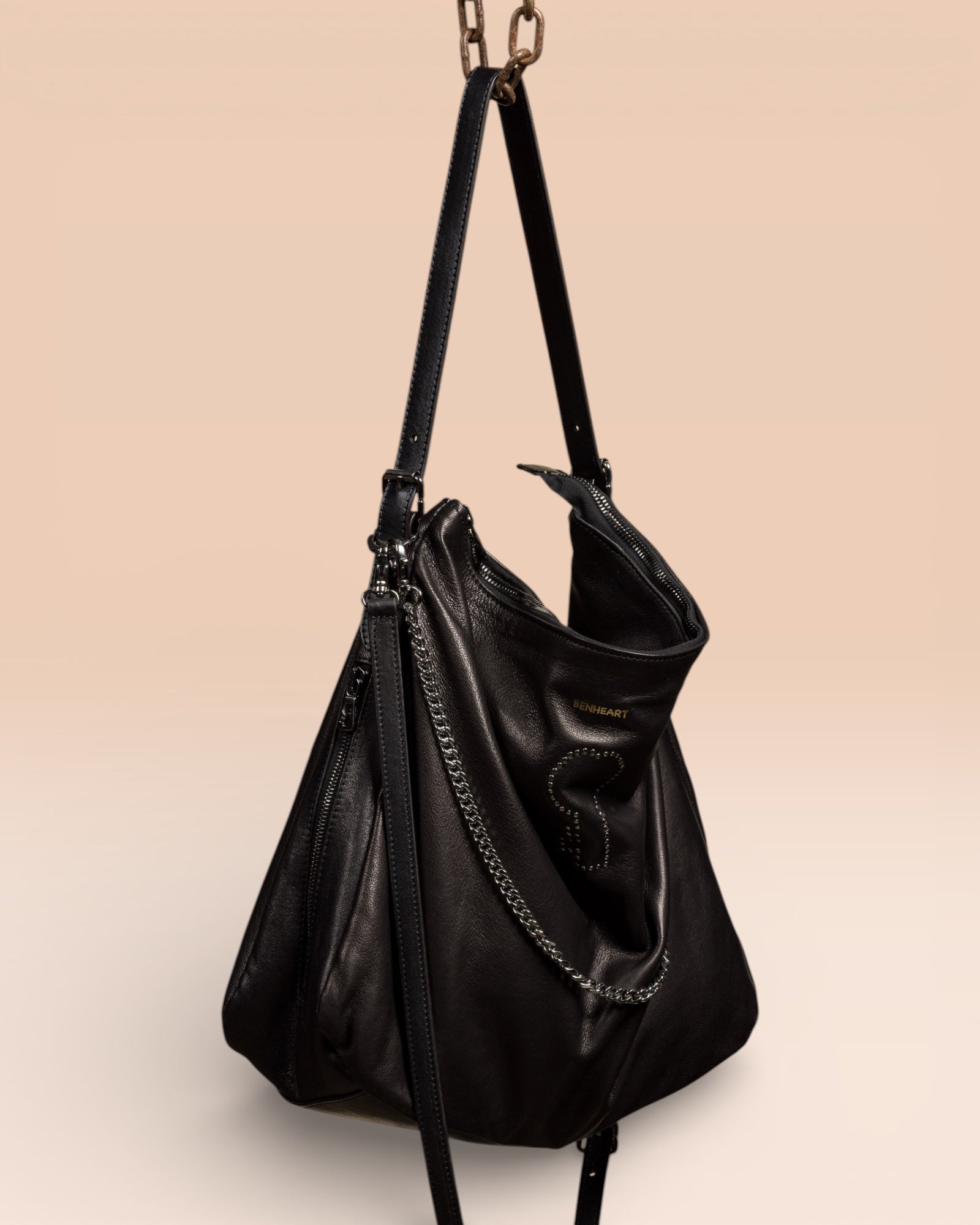 • Design: Una silhouette classica impreziosita dall’inconfondibile logo frontale con la chiave Benheart in borchie metalliche e il nome del brand impresso a caldo in oro. La combinazione di tracolla a catena e inserto in pelle aggiunge un tocco moderno e lussuoso.