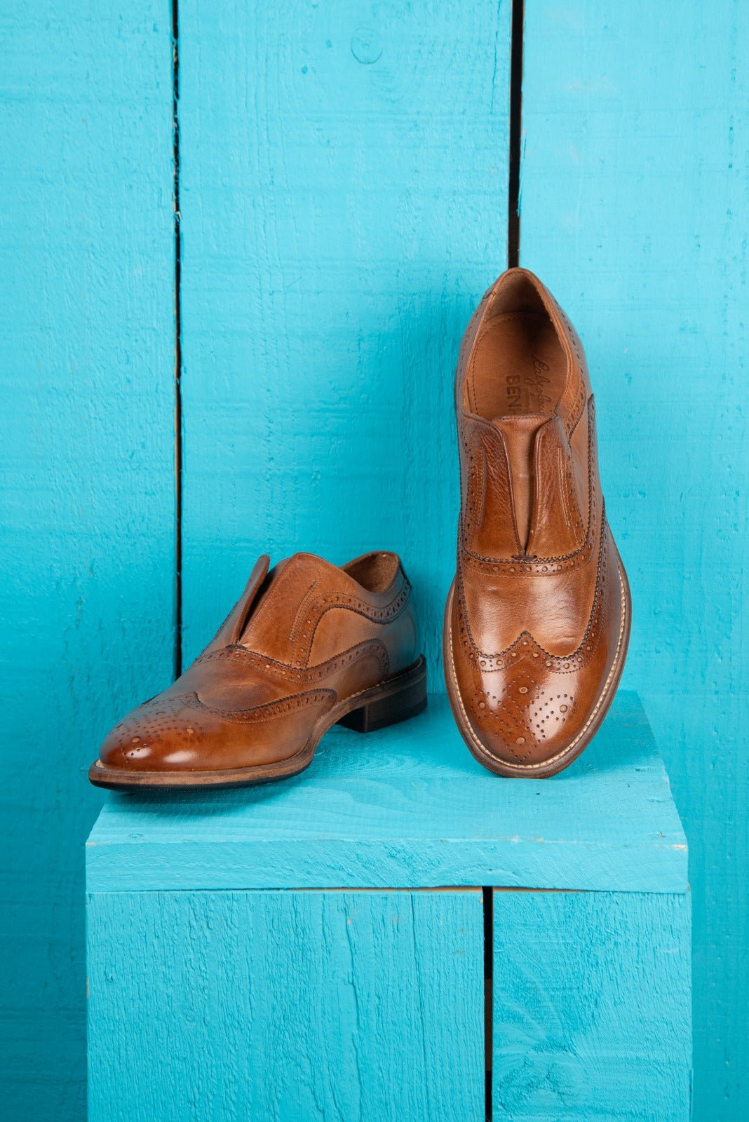 Top view of Benheart Colombo 7543 men’s tobacco leather slip-on brogue shoes.