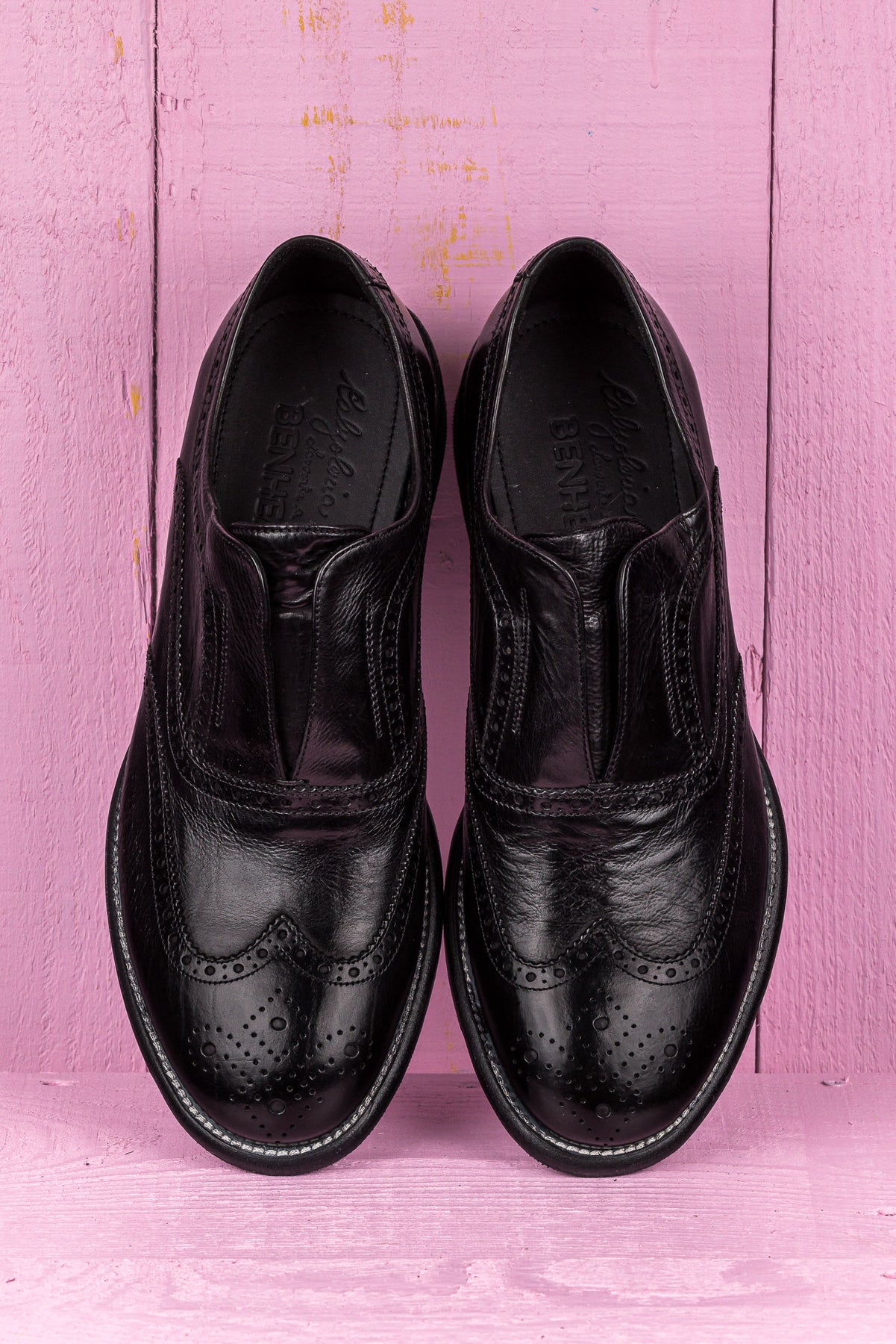 Top view of Benheart Colombo 7543 men’s black leather slip-on brogue shoes.