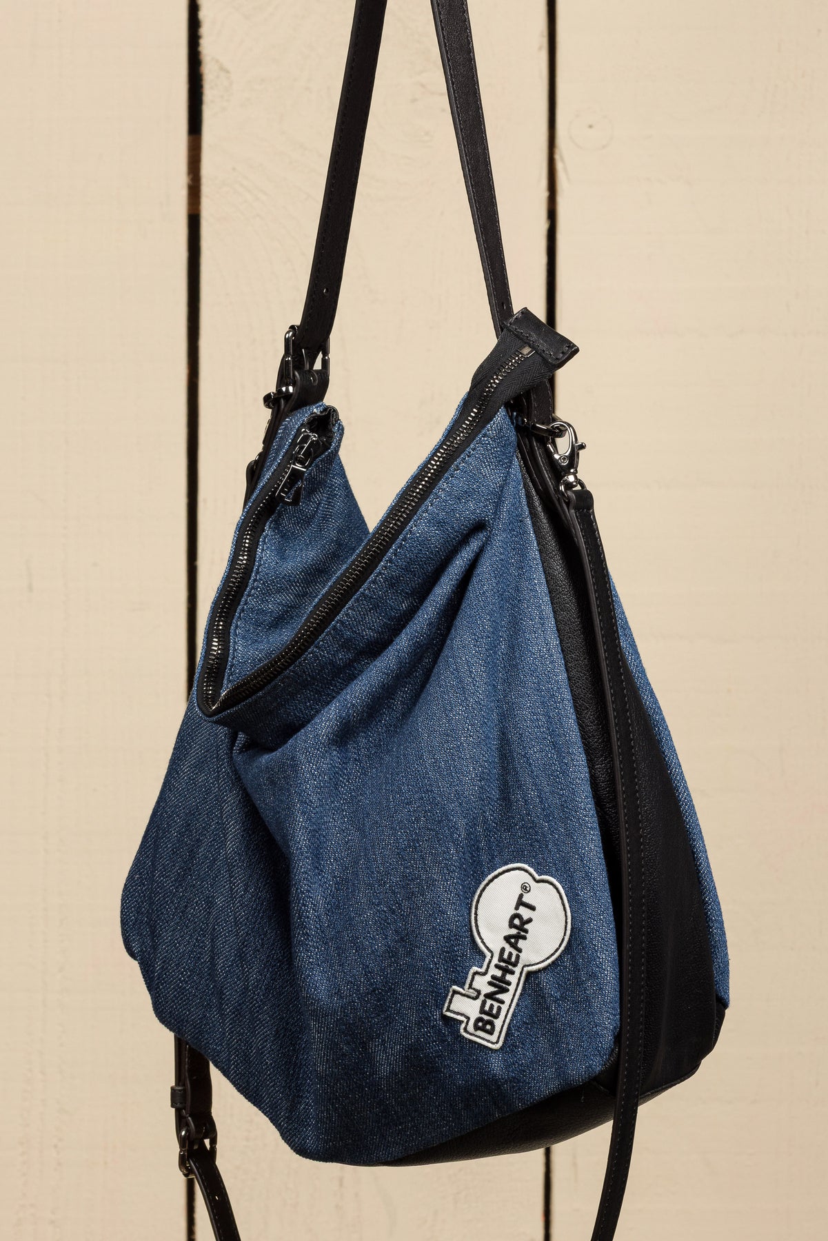 The Venice Jeans features the same spacious main compartment and functional design as the classic Venice model, with a secure central zip closure and an interior pocket for organizing essentials. The leather side panel, base, and shoulder strap add structure and durability, while the denim body brings a relaxed, versatile aesthetic. The bag is completed with a stitched fabric logo in the shape of a key - an unmistakable Benheart signature that adds character and identity.