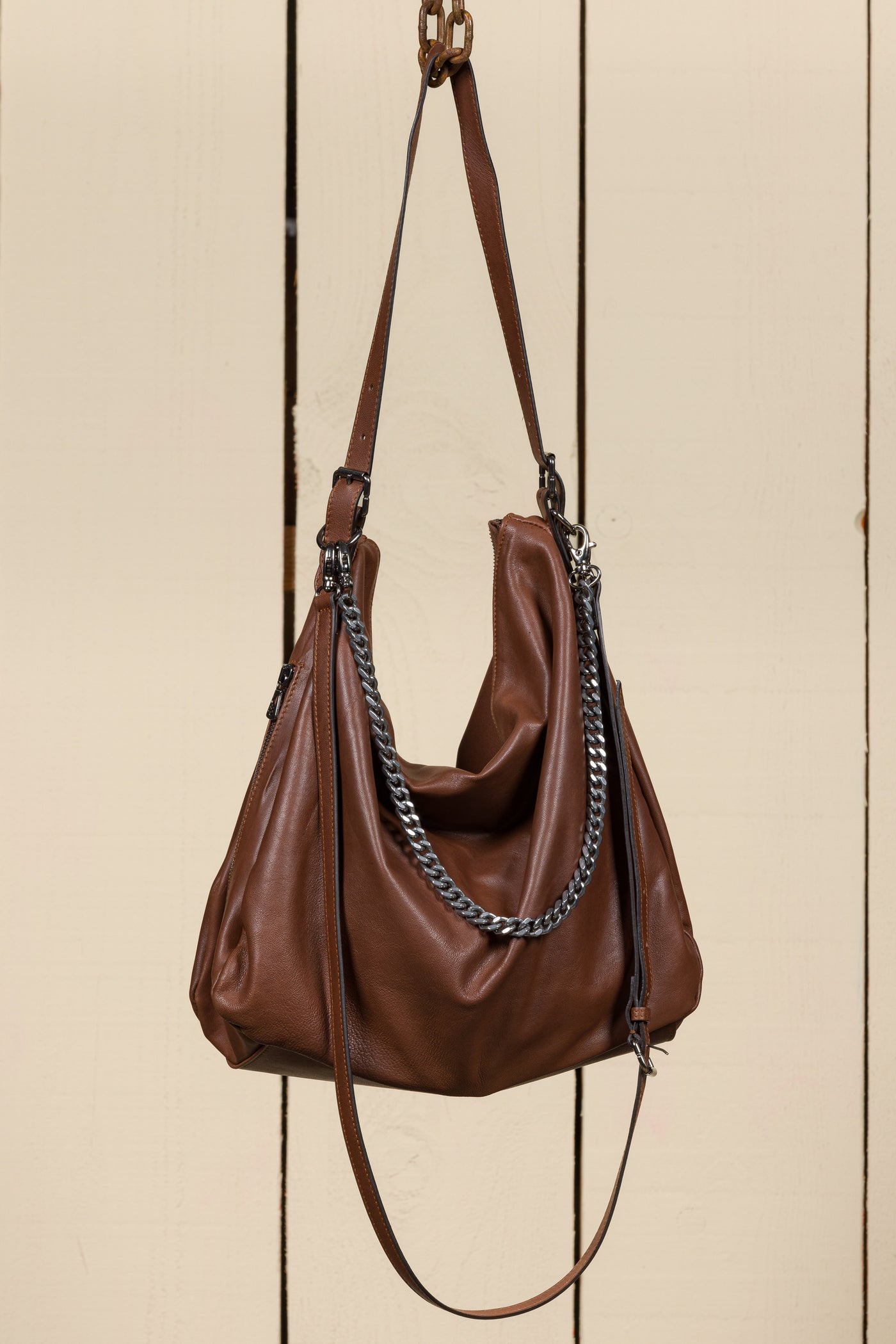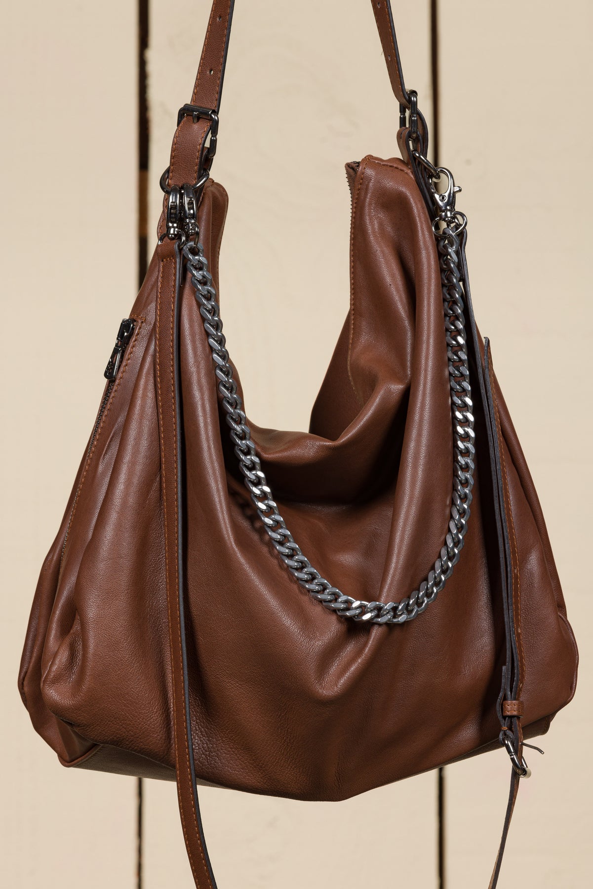 Front view of a VENICE leather bag by Beheart, leather brown color (cuoio), with chain, Made in Italy